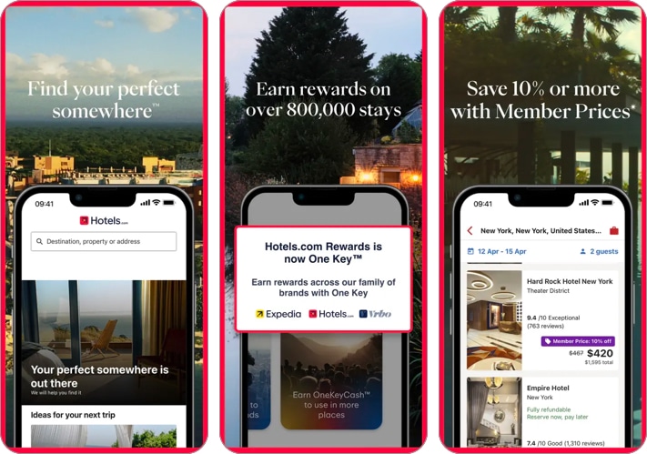 世界中の7,000を超える場所があるため、住所、都市、郵便番号、空港、または近くのアトラクションを使用して必要な場所を見つけることができます。部屋の詳細を参照して、バーチャルツアーに参加し、写真やエリアマップを表示し、Appleウォレットまたはカレンダーに予約を追加します。ポイントを獲得し、無料の滞在と余分な節約のために報酬を引き換えることができます。