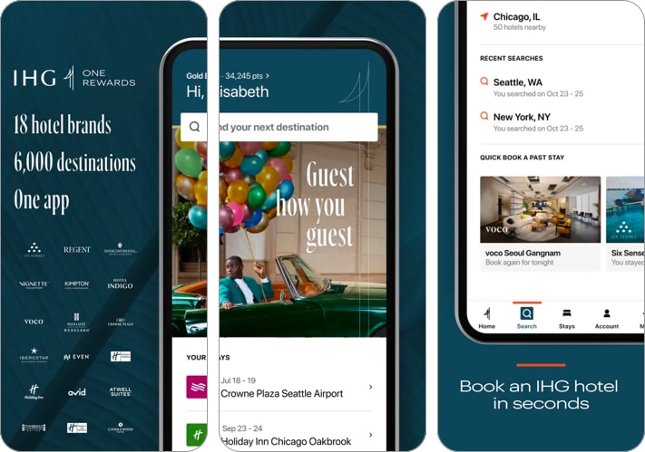 旅行のリマインダーと道順を取得し、アメニティと食事のオプションを表示し、お気に入りのホテルを簡単に再予約できます。多くの予約オプションは、最後の計画の変更がある場合、無料のキャンセルを提供します。また、報酬の特典を楽しんだり、財布にIHG One Rewardsカードをポップして、迅速にアクセスすることもできます。