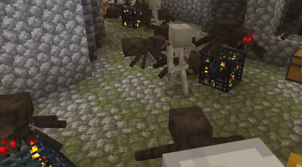あなたが良いモブ・グラインダーのセットアップが好きなら、これはあなたにとって完璧な種です。スポーンポイントのすぐ下には、3つの相互接続されたクモのスポーナーと1つのスケルトンスポーナーで構成される四重群のMob Spawnerがあります。