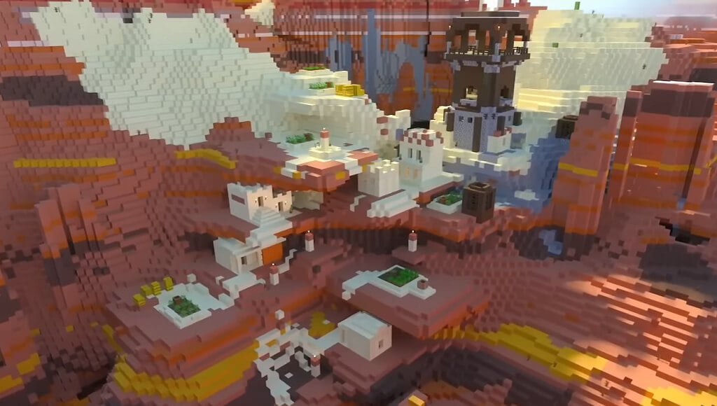 この種は、ユニークな建物の機会を持つ珍しい種子が好きな人に理想的です。あなたの新しい世界にロードすると、あなたは巨大なバッドランズバイオームにいることに気付くでしょう。しかし、奇妙なことに、真ん中に砂漠の小さなパッチがあり、征服する準備ができているピラーズの前postが含まれています。