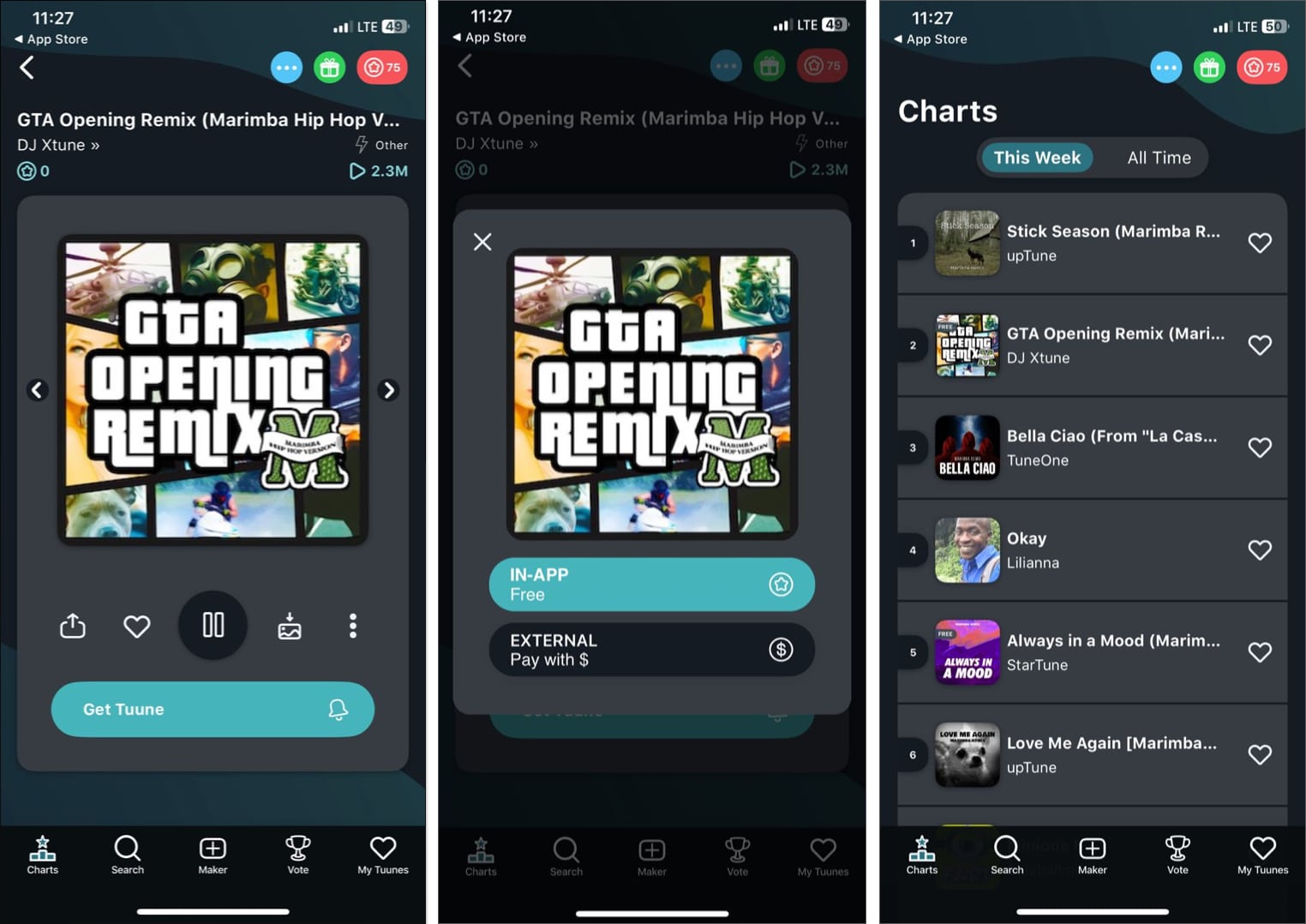 Ringtone Maker - Tuunesは、iPhone用のもう1つの優れた着信音アプリであり、最大10,000のライセンスの着信音を提供しています。ほとんどがマリンバサウンドのリミックスであるいくつかの無料の着信音がありますが、他のものをダウンロードするにはアプリ内コインが必要です。サブスクライブ、広告の監視、クイズをプレイすることでこれらを獲得できます。