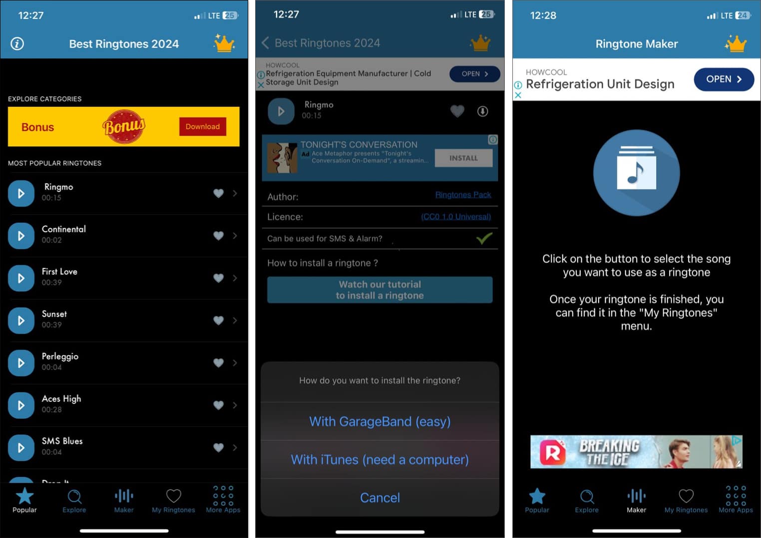 アプリ上のすべての着信音にアクセスしてダウンロードするには、プレミアムバージョンを購読する必要があります。または、1つをダウンロードするたびに、着信音を個別に購入したり、3つの広告ビデオを視聴したりできます。ダウンロードされたすべての着信音は、私の着信音に保存されます。その後、標準のガレージバンド法を使用して、iPhoneに追加できます。