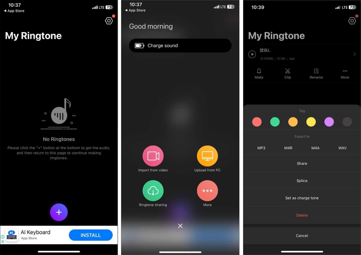 Ringtones Maker - 日本のサウンドに興味がある場合はリングアプリが完璧ですが、オーディオファイルをアップロードしてカスタム着メロを作成しようとする人にも最適です。音声共有機能(日本のサウンドがたくさんある)、ファイルアプリ、ビデオ、またはPCからオーディオをインポートできます。また、音を録音して着信音として設定したり、異なる言語、アクセント、スピーカーを使用してテキストからスピーチを使用したりすることができます。