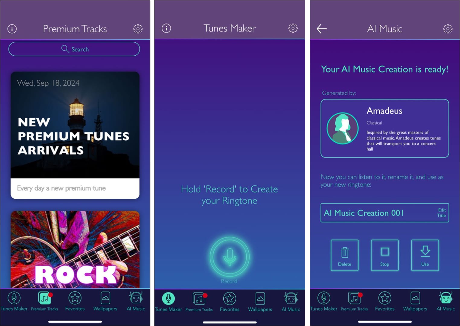 着信音を録音することはできましたが、アプリは有料プランを選択せずに録音を着信音として追加することを許可しませんでした。また、有料ユーザーでなくてもプレミアムトラックにアクセスできませんでした。 iPhone用のこの着信音アプリには、AIミュージック機能も含まれています。これにより、AIでサウンドを生成し、まともな壁紙のコレクションを生成できます。