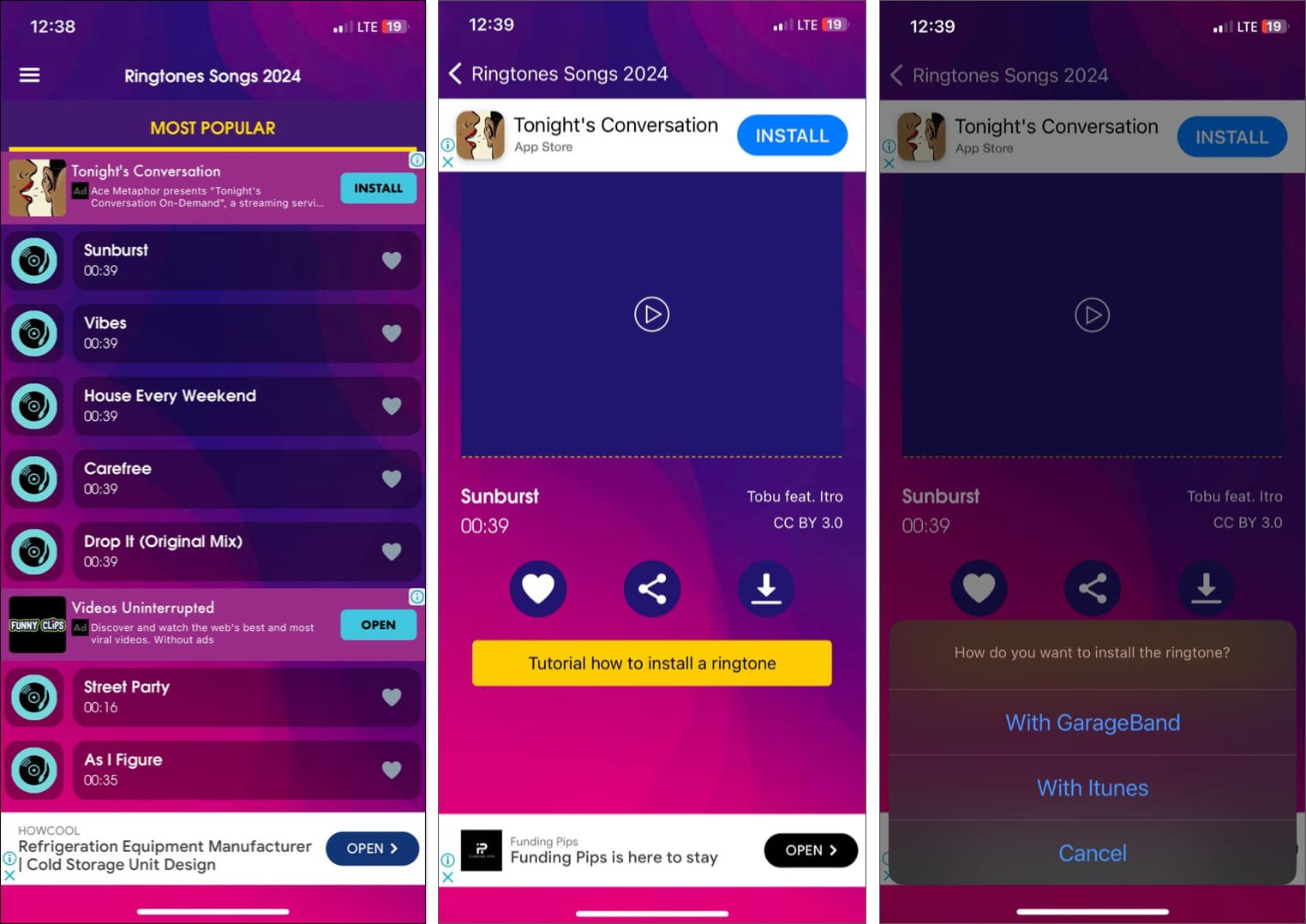 アプリの各着信音の隣には、お気に入りを保存するためのハートアイコン(私のコレクションに保存されたサウンドが見つかります)と、iPhoneに着信音を追加するダウンロードアイコンがあります。アプリはガレージバンドを使用して着信音を設定しますが、プロセスは簡単です。さらに、それはあなたを導くためのチュートリアルを提供しますが、おそらくあなたはそれを必要としないでしょう。