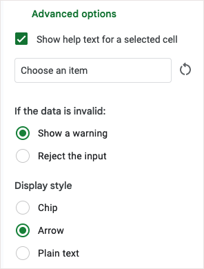- ヘルプテキストを表示するには、無効なデータのアクションを選択するか、表示スタイルを選択するには、高度なオプションセクションを展開します。