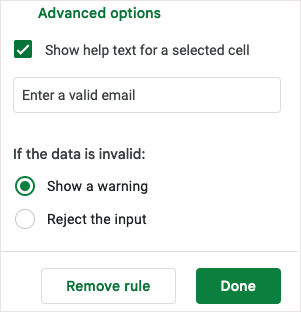 - オプションで、ヘルプテキストの表示、警告の表示、入力の拒否など、高度なオプションを選択します。選ぶ終わり検証ルールを保存して適用します。
