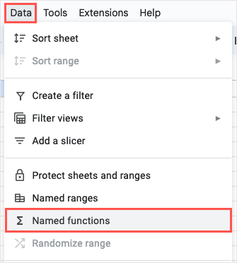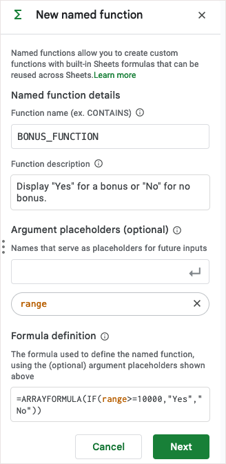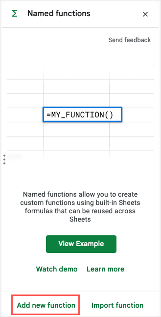 - オープンする名前付き関数サイドバーで使用します新しい関数を追加します下部にカスタム関数を作成します。また、例を見たり、デモンストレーションを見たり、機能の詳細を確認したりすることもできます。