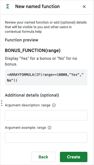 - 関数のプレビューをチェックして、どちらかを選択してください戻る変更を加えるために作成する新しい関数を保存します。必要に応じて、オプションの引数を追加することもできます。