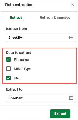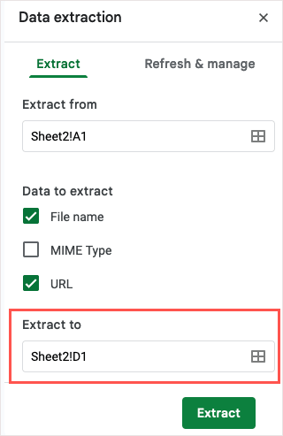 - を使用しますに抽出しますデータが必要なシートの場所を入力または選択するフィールド。