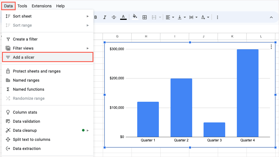 チャートを挿入したら、それを選択して行きますデータ>スライサーを追加しますメニューで。