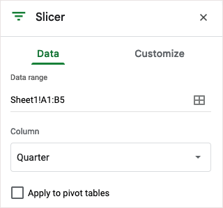 サイドバーが開いたら、開きますデータタブ、上部のデータ範囲を確認し、フィルターに使用する列を選択します。