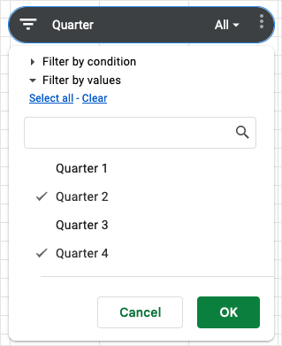 スライサーができたら、選択しますフィルター左またはドロップダウンのボタン矢印右側に。次に、それらのアイテムの横にチェックマークを配置するチャートで表示するデータを選択します。