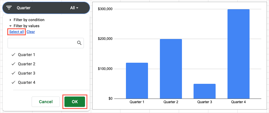 チャートをすべてのデータを表示する元のビューに戻すには、フィルターを開いて選択しますすべてを選択します>わかりました。