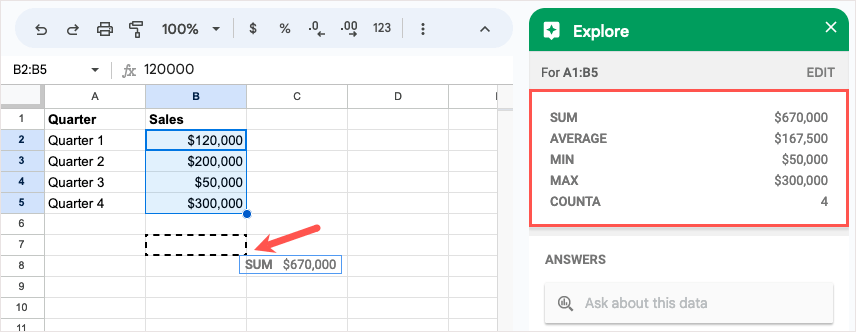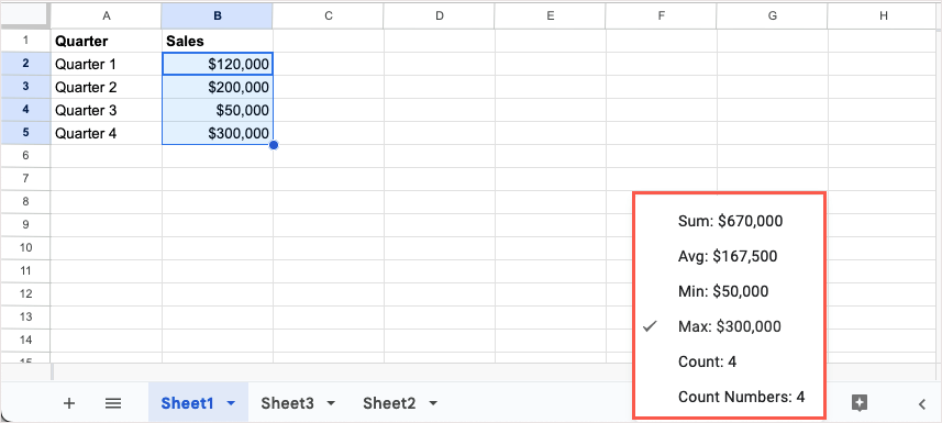 シートに式を追加せずに簡単な計算を見たい場合があります。 Googleシートでは、単に値を選択してから、追加の作業なしで表示する計算を選択できます。