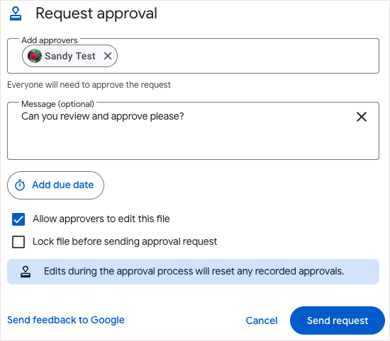 ポップアップウィンドウに、リクエストを承認したいものとオプションでメッセージを追加します。期日を含めたり、承認者がシートを編集したり、承認のリクエストを送信する前にファイルをロックしたりすることもできます。選ぶリクエストを送信します終わったら。