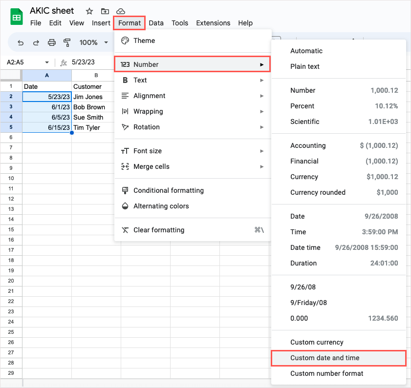 - 日付または時刻を含むセルを選択して、形式>番号>カスタム日付 と時間。または、ツールバーでその他のフォーマットオプションを選択して選択できますカスタム日付 と時間。