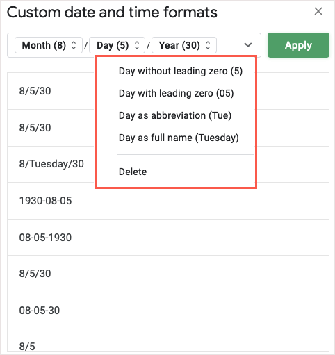 - ウィンドウが開くと、日付や時間の現在の形式が表示されます。上部の既存の要素を選択して、フォーマットを変更するか、削除します。