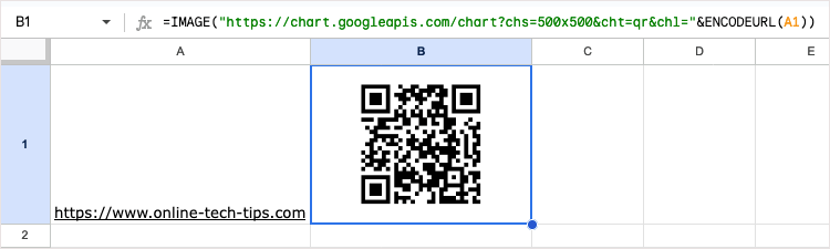 ここでは、以下の式を使用して、Cell A1のWebサイトにリンクします。 QRコードが必要な場所に式をセルに配置します。
