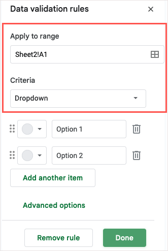 - 終了したら、選択します終わり。次に、新しいドロップダウンリストを使用して、シートにデータを入力します。