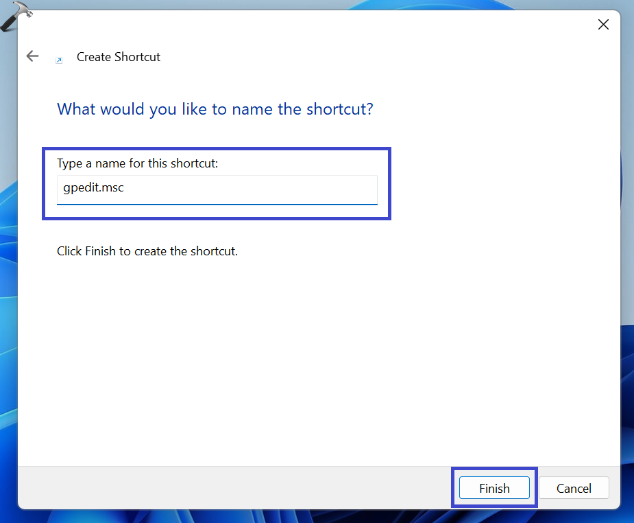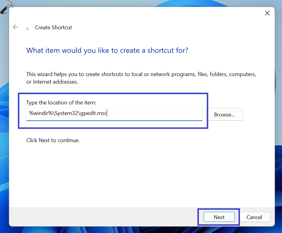 3。このショートカットの名前を入力します「、「gpedit.msc」と入力します。