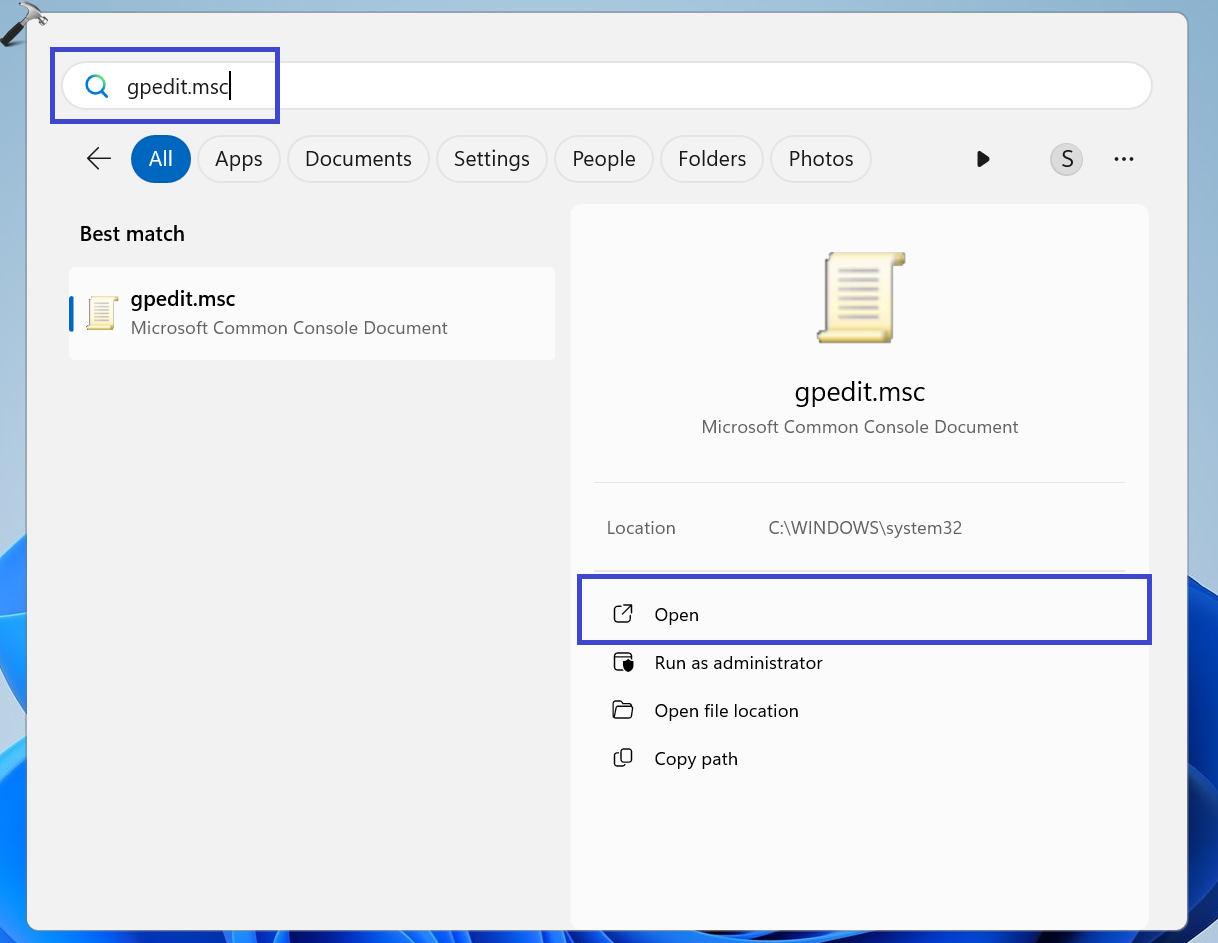 2。タイプ「ローカルグループポリシーエディターを開きます」とEnterを押します。