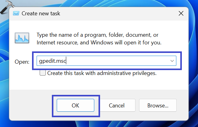3.新しいタスクプロンプトボックスの作成が表示されます。タイプ "gpedit.msc」と[OK]をクリックします。
