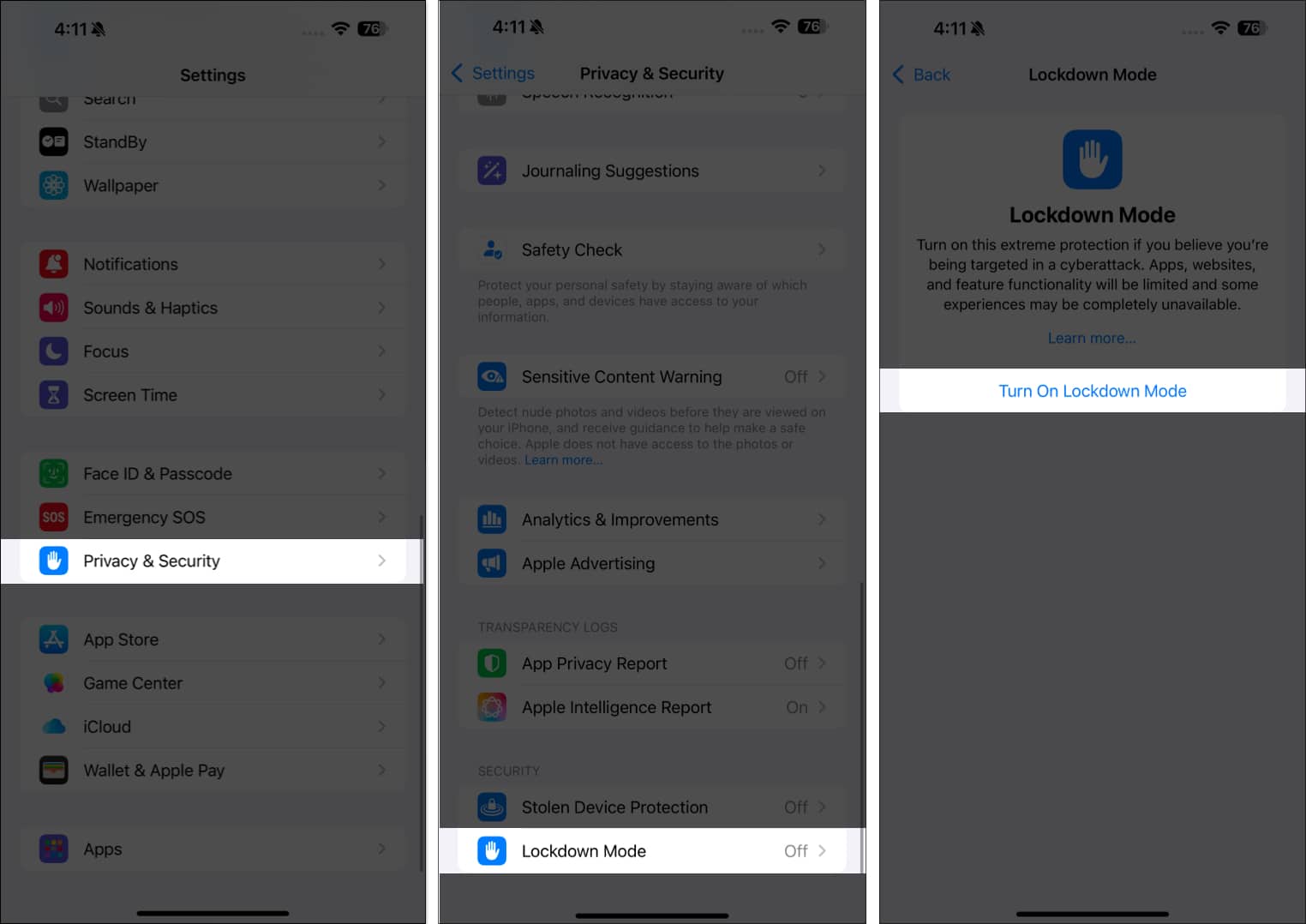 iPhoneでロックダウンモードを有効にするには、移動します設定→プライバシーとセキュリティ→ロックダウンモードタップしますロックダウンモードをオンにします。