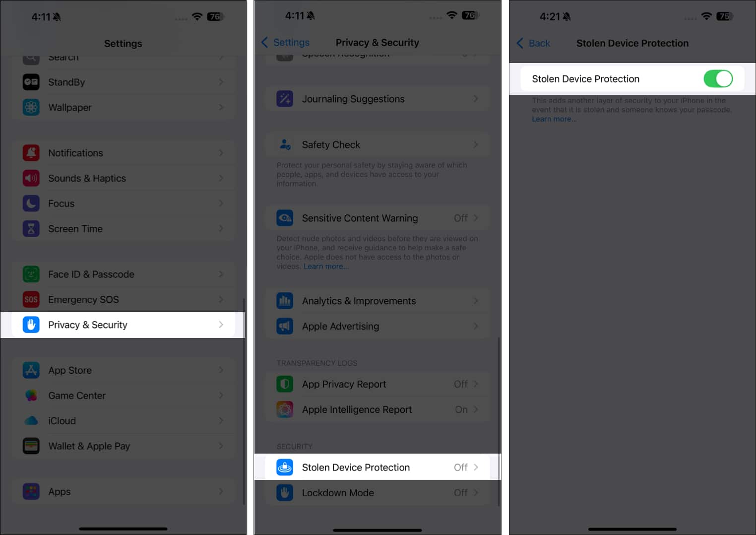 盗まれたデバイスの保護をオンにするのは簡単です。行きます設定→プライバシーとセキュリティオンに切り替えます盗まれたデバイス保護。