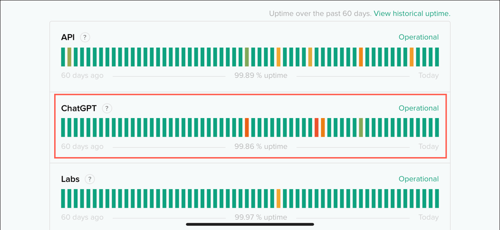 OpenaiステータスページにアクセスしてくださいすべてのChatGPTシステムが動作していることを確認してください。また、次のようなソーシャルメディアサイトで他のChatGPTユーザーからの停止のレポートを確認することもできますreddit。
