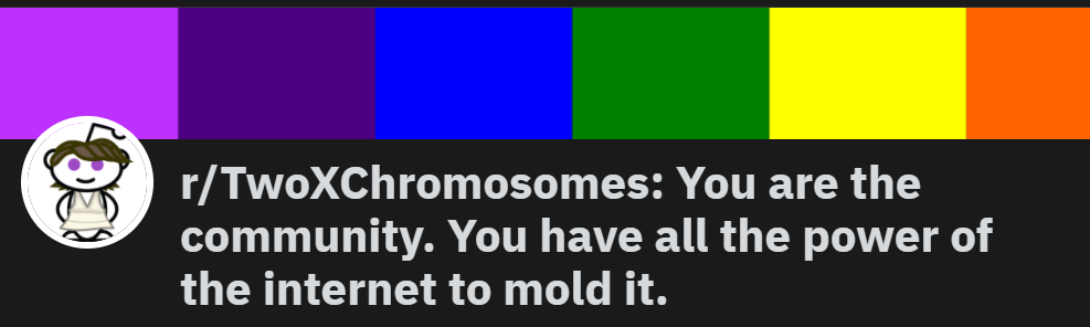 「怒りのコミックやガーリーな傾斜を備えた他のミームのためのsubreddit」トロルxchromosomesは、823,000人の2件よりもはるかに少ない聴衆を持っています。許容可能な提出には、高品質のGIF、写真、ミームが含まれます。このサブは、r/2xchromosomesがデフォルトのサブレッドディットの1つになった後に作成され、男性の大量の流入につながりました。 R/Trollxchromosomesでコメントする男性が少なくなり、さらに多くのミームが見つかります。