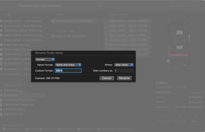 たとえば、形式を選択して、複数のファイルの名前を一度に変更するために設定を選択できます。