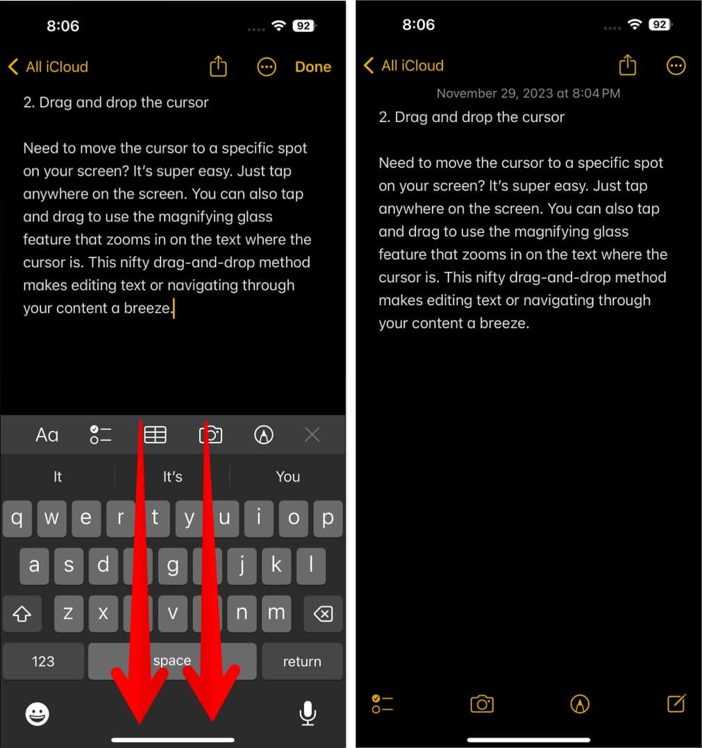 QuickPath機能に加えて、もう1つのクールなiPhoneキーボードのトリックは、キーボードをトラックパッドに変換することです。これは、大量のテキストを扱うときに特に役立ちます。カーソルを配置するには、正確な精度が必要です。