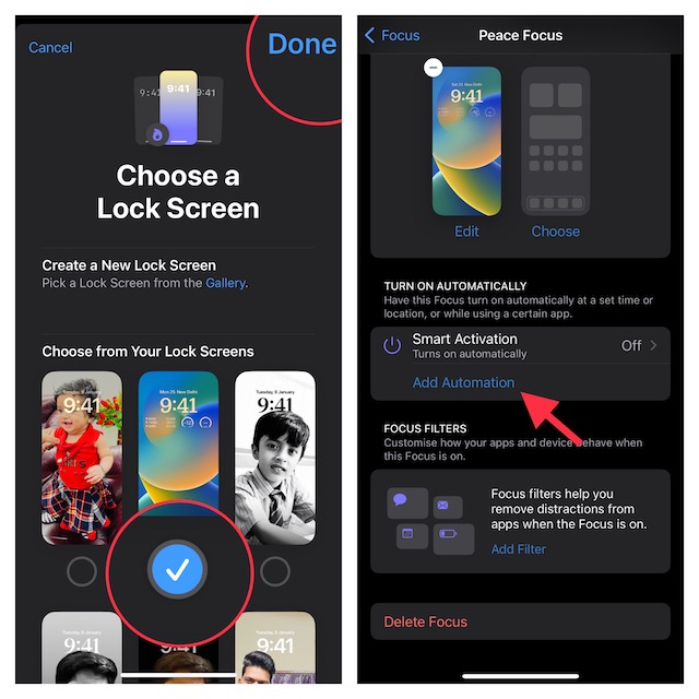 開きますiPhoneの設定アプリ - >フォーカス - >「+」ボタン画面の右上隅に - >カスタム。次に、新しいフォーカスプロファイルを作成します。その後、新しいロック画面を作成するか、すでに作成されたロック画面を選択します。次に、自動化して、必要なときにアクティブになります。