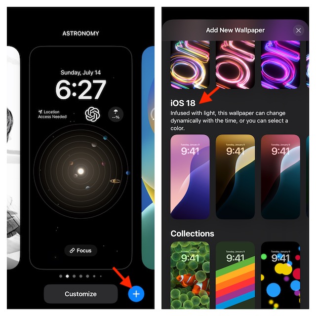 1。最初に、FaceIDまたはTouch IDでiPhoneのロックを解除>ロングプレスオンオン壁紙ギャラリーを育てる画面。次に、タップします「+」ボタン画面の右下隅に。