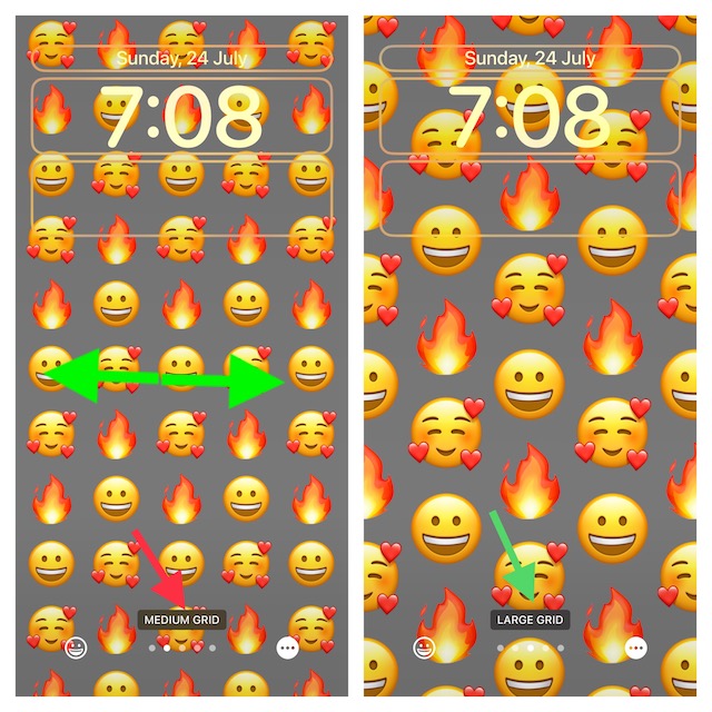 2。次に、選択します絵文字オプションの一番上の行から。その後、さまざまな背景を使用して壁紙をカスタマイズします。画面上で左/右をスワイプして背景を切り替え、絵文字ピッカーを使用して楽しい愛する絵文字を選択します。