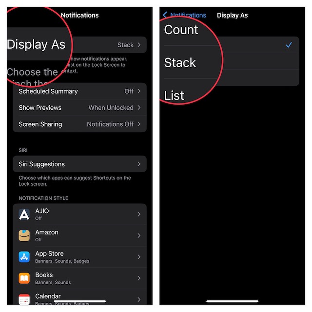 そうするために、に行きます設定アプリ - >通知 - >表示asの下セクション、「カウント」オプションを選択します。今後、通知はロック画面にカウントされます。たとえば、1つの通知、2つの通知など。