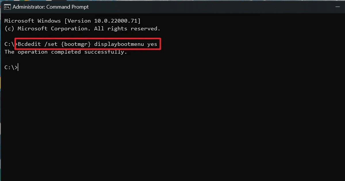 Bcdedit /set {bootmgr} displaybootmenu yes