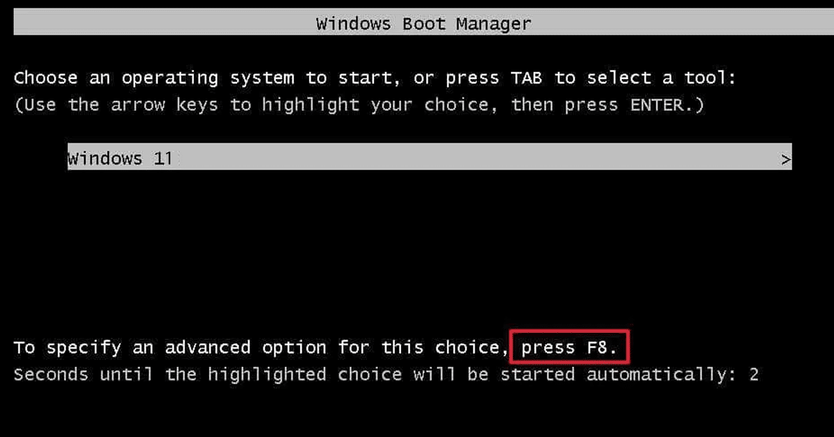 - 「Windowsブートマネージャー」メニュー、押します」F8」スタートアップ設定メニューオプションにアクセスするためのキー。