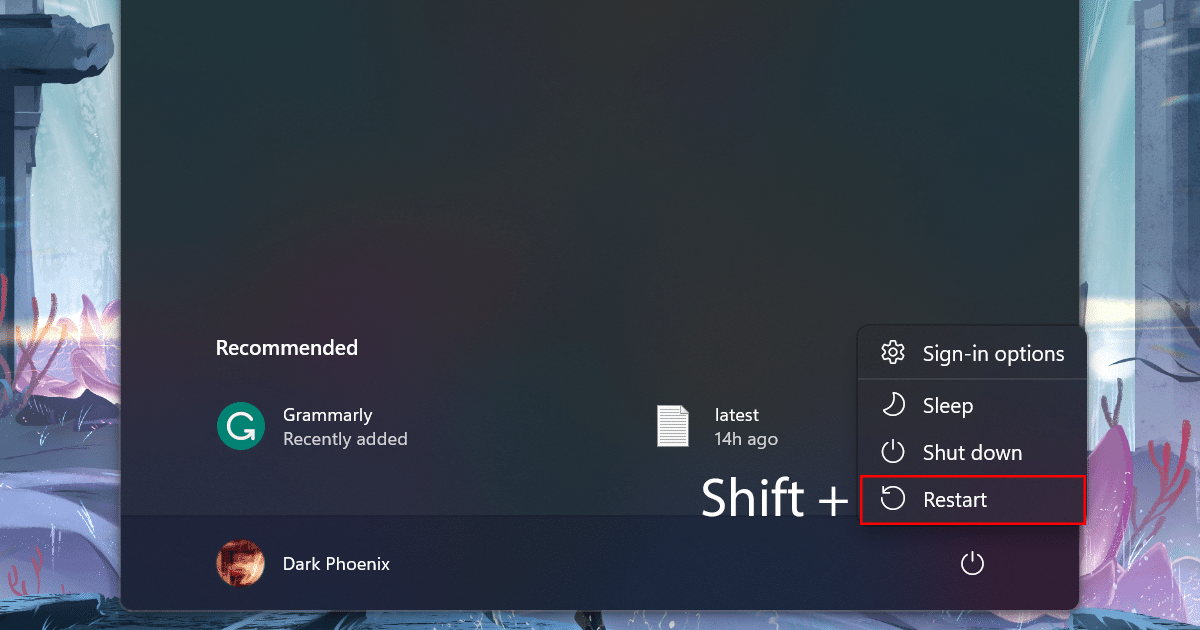 - 押し続けますシフトキーとクリックします再起動ボタン。