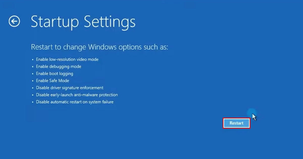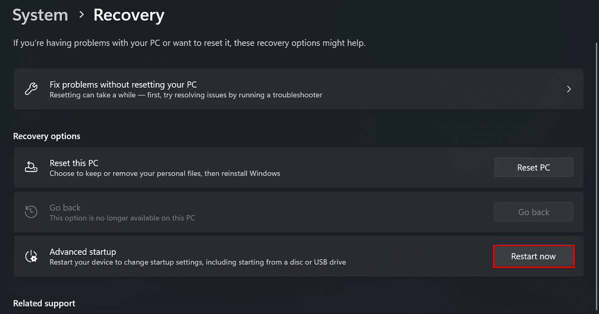 - 「下で高度なスタートアップ」セクション、クリックします再起動さあボタン。