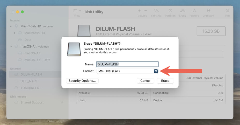 - 設定します形式にexfatまたはMS-DOS(脂肪)。