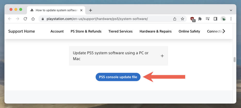 - ダウンロードしてください最新のPS5システムソフトウェアアップデートファイル公式PlayStation Webサイトから。重量は約1〜1.5ギガバイトです。