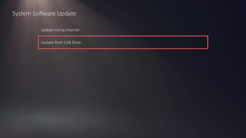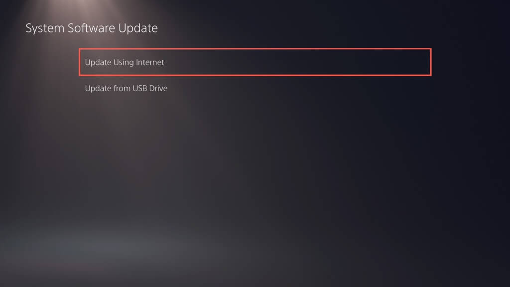 - 選択しますインターネットを使用して更新します。それが失敗した場合は、USBフラッシュドライブをPS5システムソフトウェアアップデートファイルに接続して、USBドライブからの更新オプション。