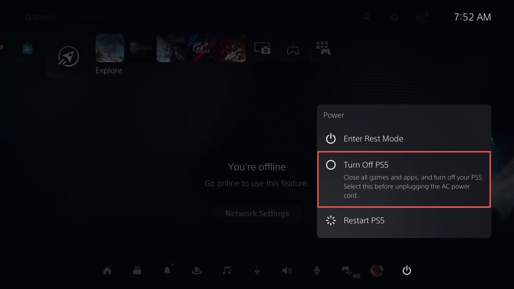 - デュアルセンスまたはデュアルセンスエッジコントローラーを押しますPSボタン、選択します力>ps5をオフにします。