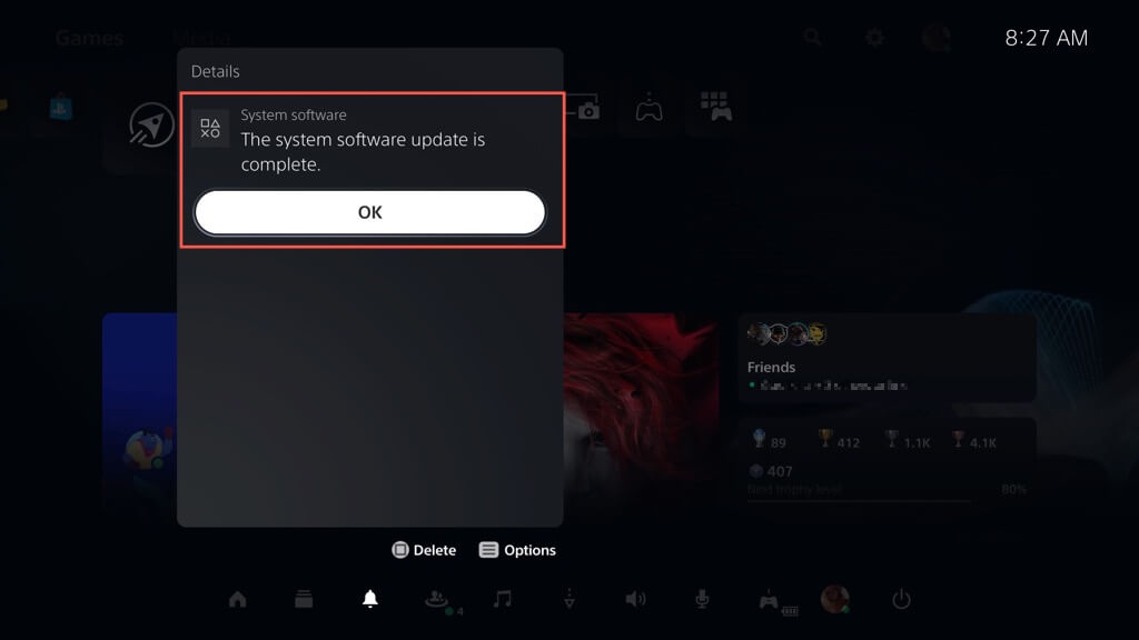 コンソールが再び再起動します。コンソールが最新のものであることの確認として、「システムソフトウェアの更新が完全です」という通知がホーム画面に表示されるはずです。