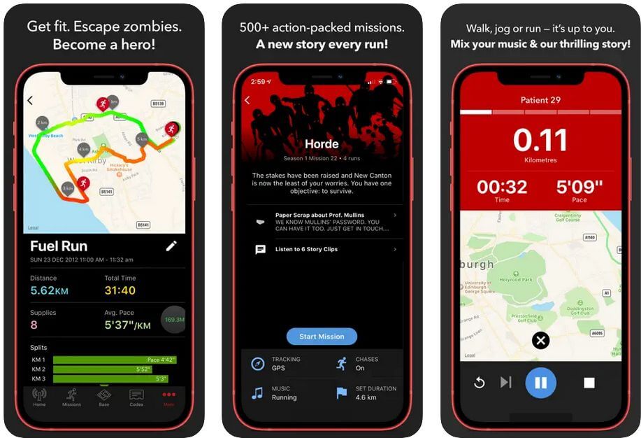 この人気のあるアプリは、ウォーキング、ランニング、ジョギングの身体活動をゲーム化するために作成されました。アプリの主な機能は、ゾンビに追われた経験を実行して模倣しながら聴くことができる黙示録的なゾンビの物語です。アクティブになるたびにストーリーを継続するためにミッションを完了することができます。