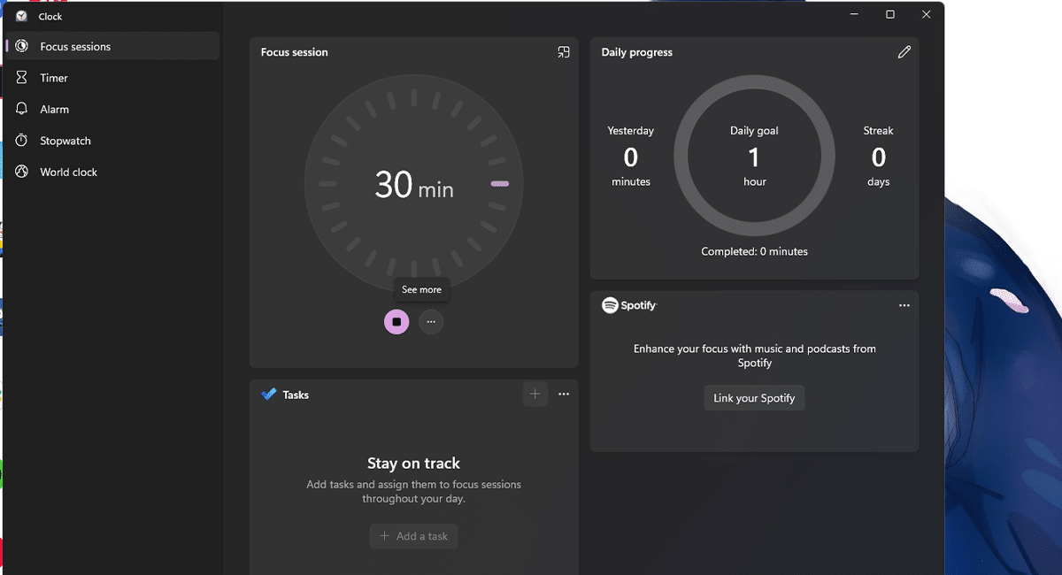 - クロックアプリ内で、15分から最大240分まで開始すると、フォーカスセッションを設定できます。また、リラックスや仕事中に音楽を聴くためにSpotifyをセットアップすることもできます。