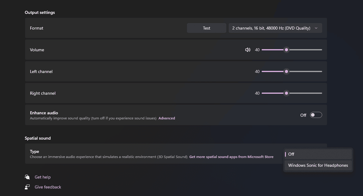- 以下に、「空間サウンド」のオプションを表示します>オフから「ヘッドフォン用のWindows Sonic」にオプションを変更するだけです。