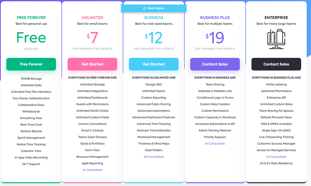 - 仕事:ユーザーあたり月額12ドル。無制限の計画のすべてに加えて、時間追跡、自動化、パブリック共有などの高度な機能のスタック。